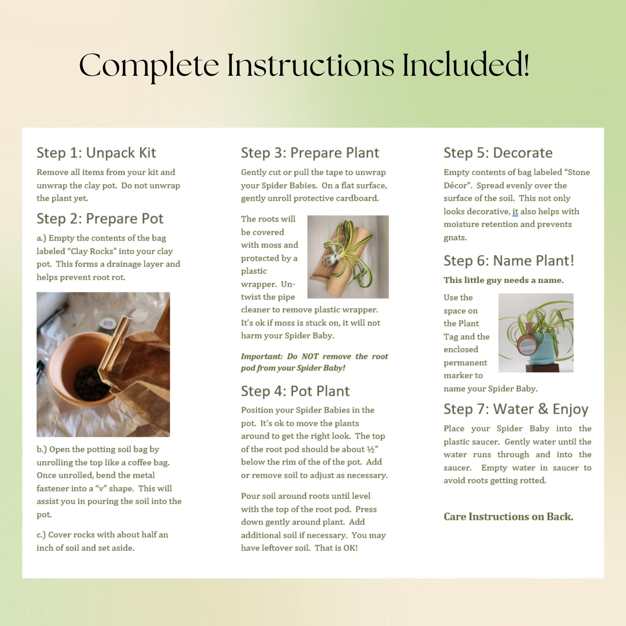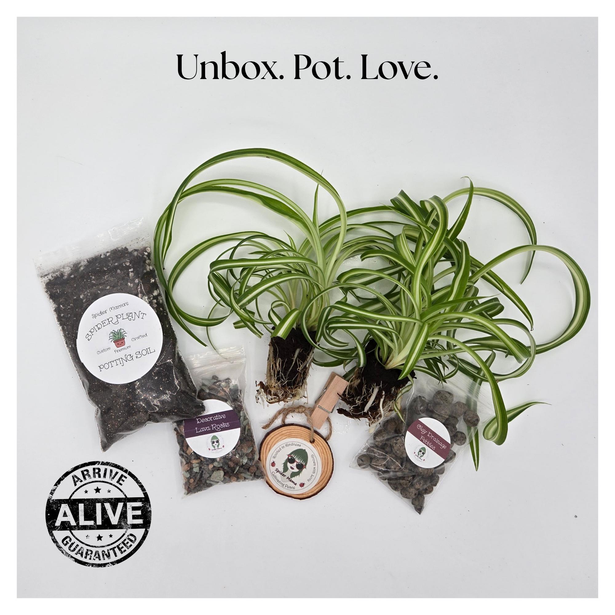 Unlike many kits that ship a pre-potted plant (often messy and in need of repotting), this kit is designed to be clean, customizable, and beginner friendly. You’ll receive rooted spider plants and everything you need to pot them yourself: no extra supplies needed.