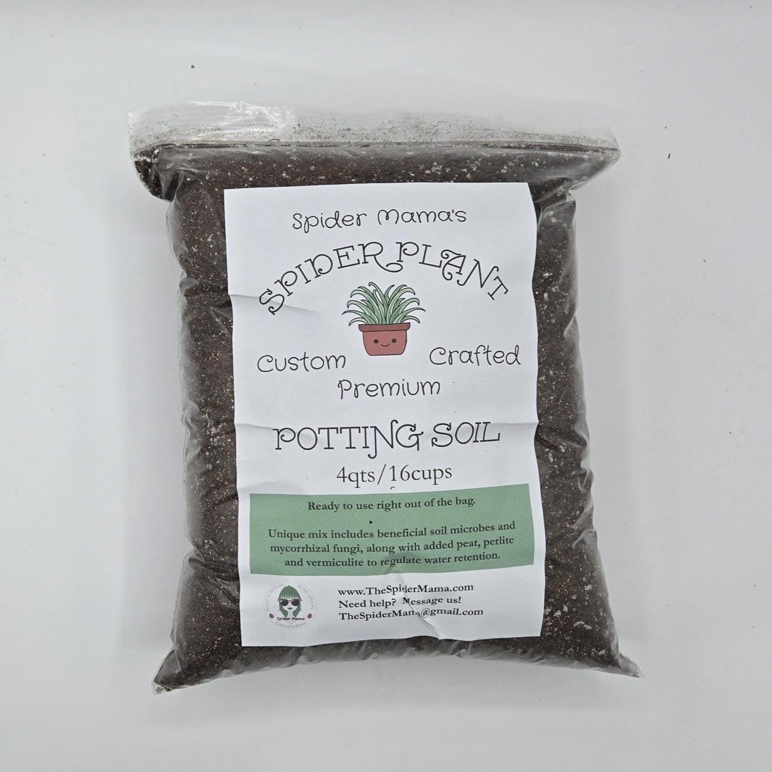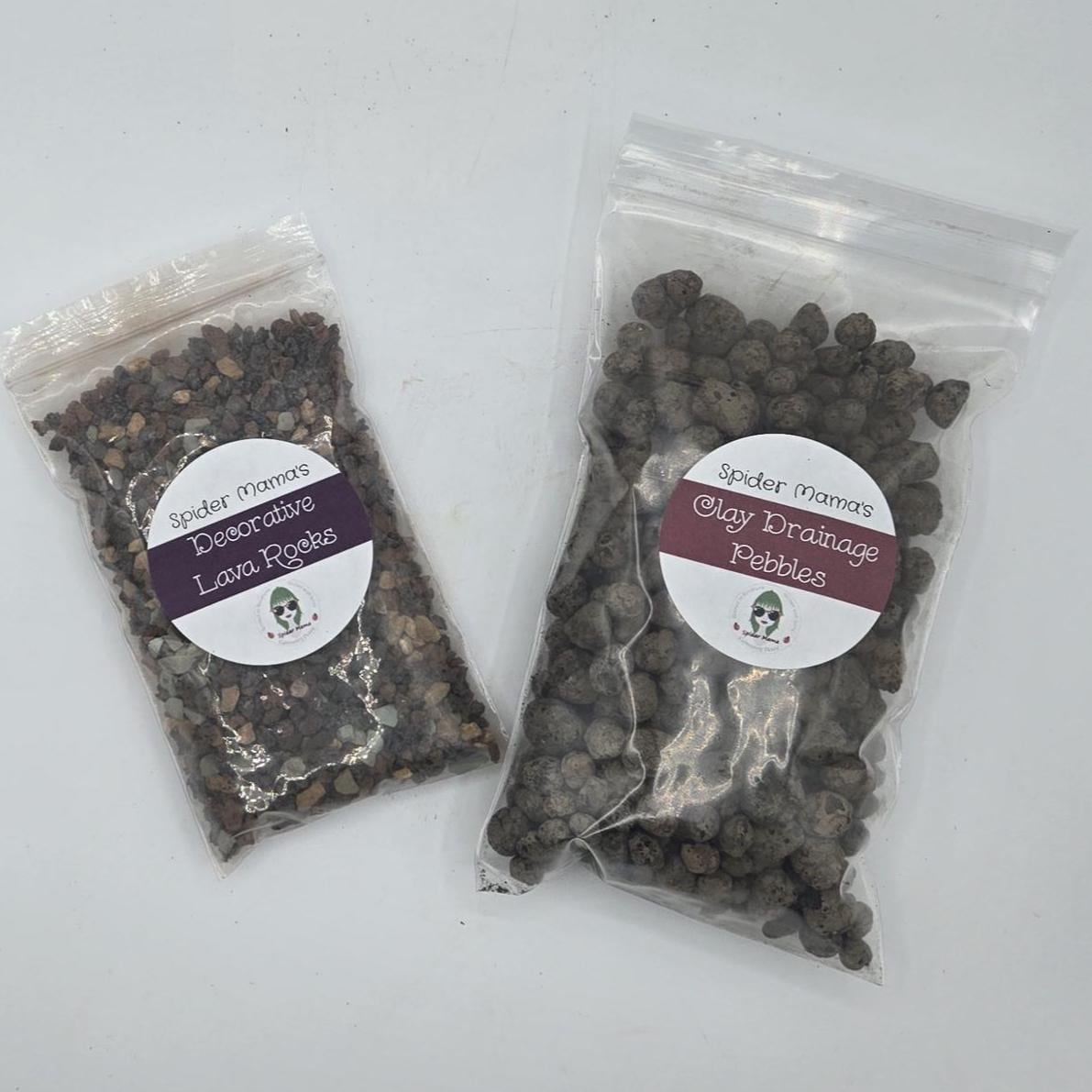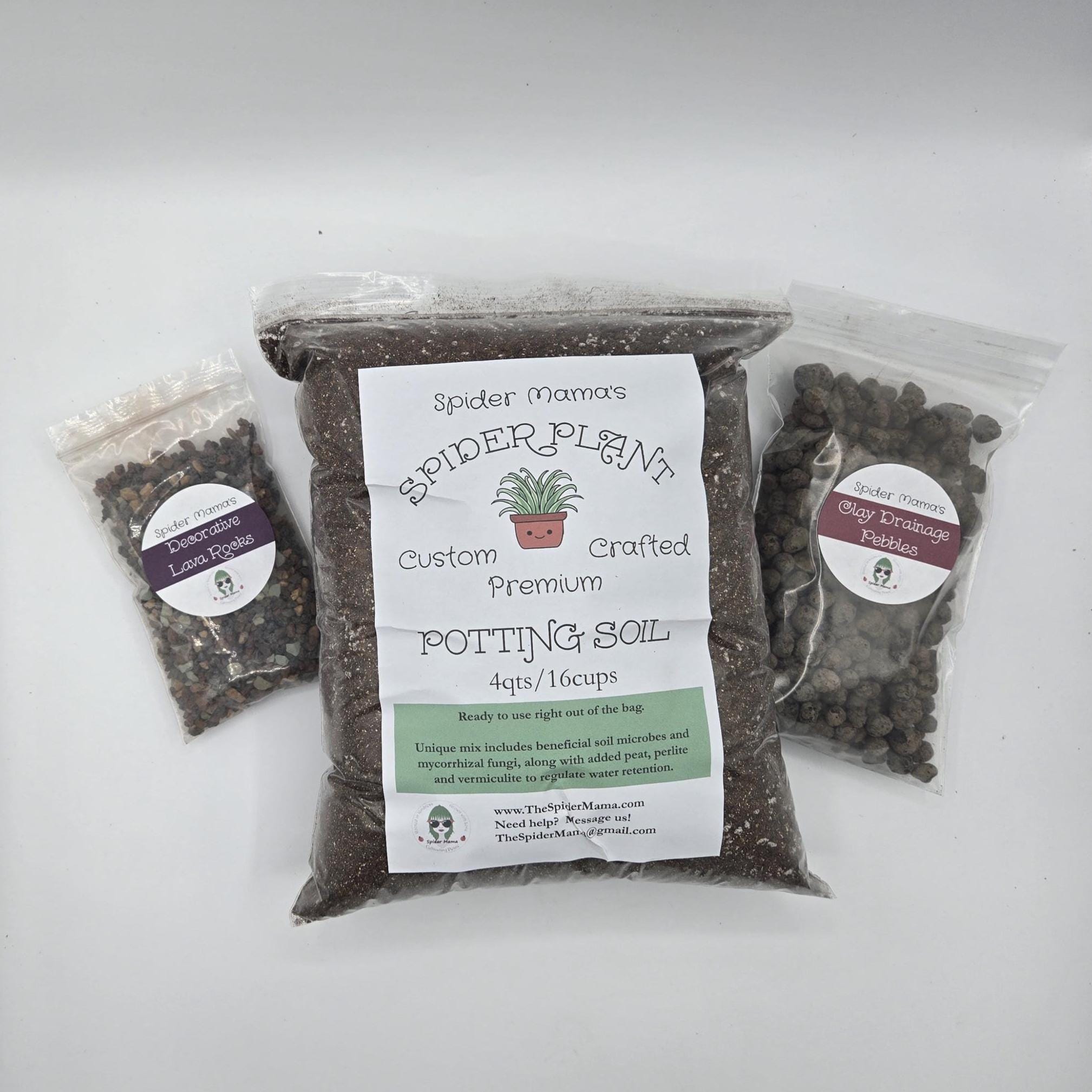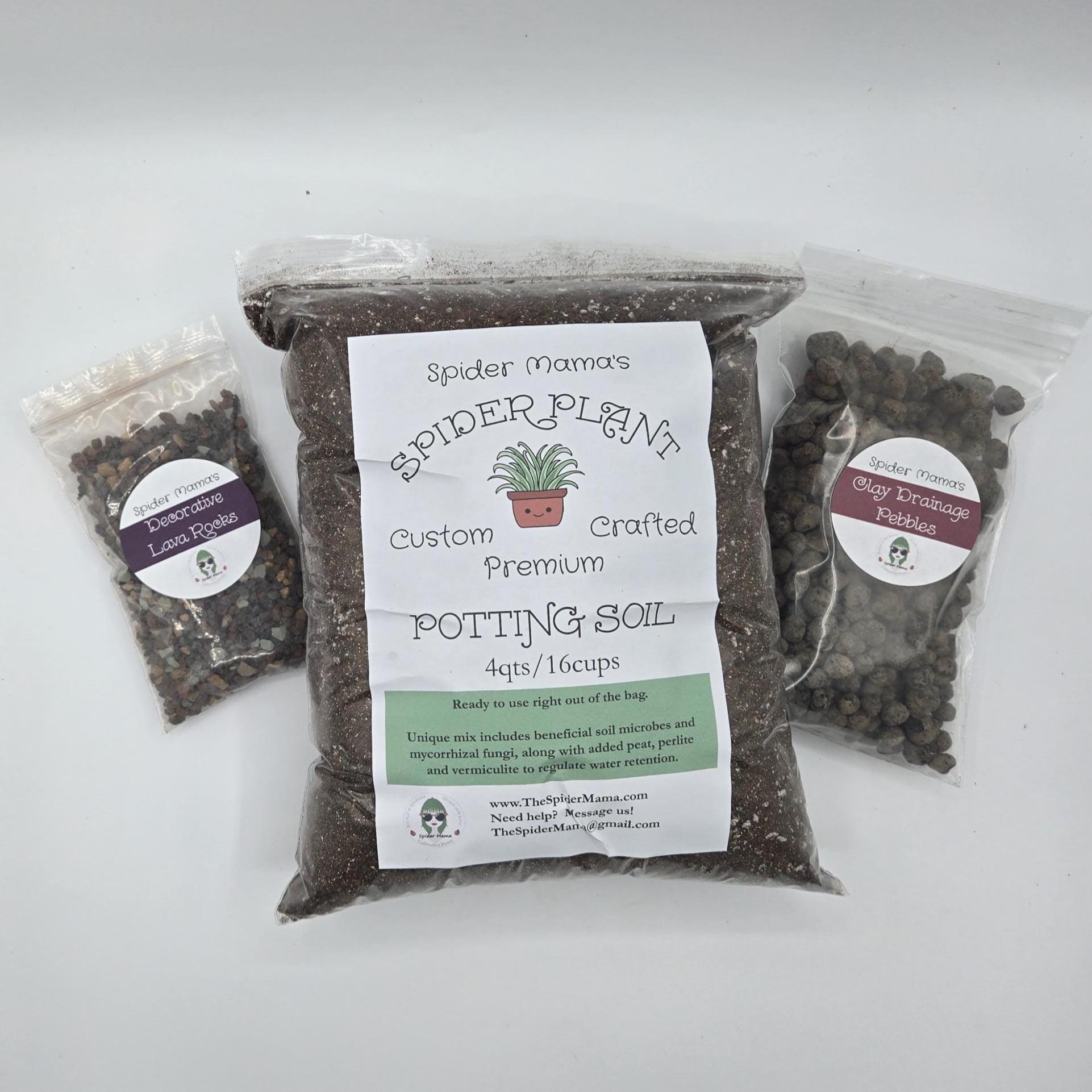 You get: 4 quarts (16 cups) Premium Spider Plant Soil Mix; 1 cup Decorative Lava Rocks; 1.5 cups Clay Rocks.  Everything you need to re-home your Spider Plants up to 10" pots.
